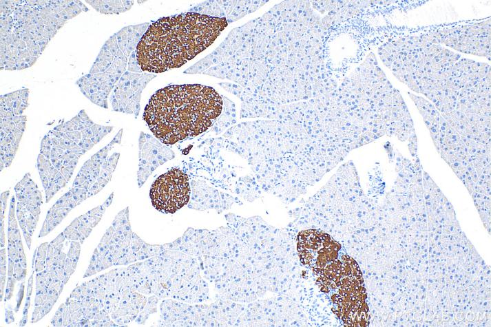 IHC analysis of mouse pancreas tissue with Proteintech’s Synaptophysin rabbit polyclonal antibody (17785-1-AP). Heat-induced epitope retrieval was performed using Tris-EDTA Antigen Retrieval Buffer (PR30002).