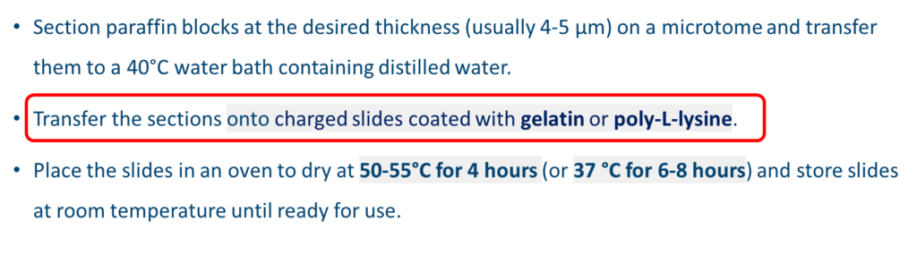 在玻片上塗抹一層多聚賴氨酸(poly-L-Lysine,一種帶正電的分子)以產生很強的靜電引力,可使組織附著於玻片上較不易脫落。