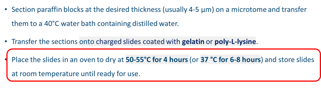 附註: 切片放置太久,也會損失抗原性。因此切片完成後應儘量在二週內使用。若無法於二星期內染色,可將切片置於防潮箱,但不建議擱置超過四至六週。