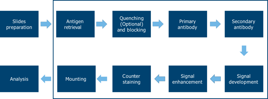 免疫組織化學 (Immunohistochemistry, IHC) 染色實驗透過抗體與目標抗原的結合,在組織切片上準確定位並呈現可視化效果,以精確觀察目標蛋白質在組織中的位置和分佈情況,進行健康組織和患病組織的比較研究。總而言之,IHC 在臨床醫學、基礎研究和病理學領域扮演重要角色,協助科學家進一步研究和理解蛋白質表達情況及相關疾病的機制。