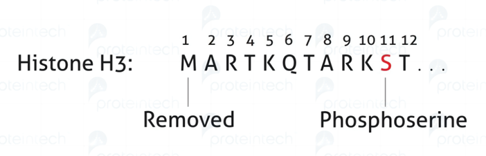範例:Histone H3 磷酸化Ser10(貨號:66863-1-Ig)在序列上其實是第11個胺基酸。去除甲硫胺酸以後就變為第10個胺基酸。