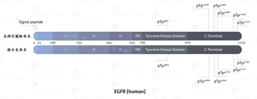 表皮生長因子受體(EGFR) 是受體酪胺酸激酶(RTK) 之一。它定位於細胞膜,結合EGF 家族的配體並活化多個信號級聯,將細胞外訊號轉化為適當的細胞反應。其N端存在1-24 aa的信號肽。去掉或不去掉信號肽磷酸化位點命名如下圖3。