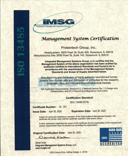 HumanKine® 系統 ( HEK293 ) 純化的蛋白質是經過 ISO 13485 認證的 GMP 輔助材料,因此可用於臨床實驗過程。