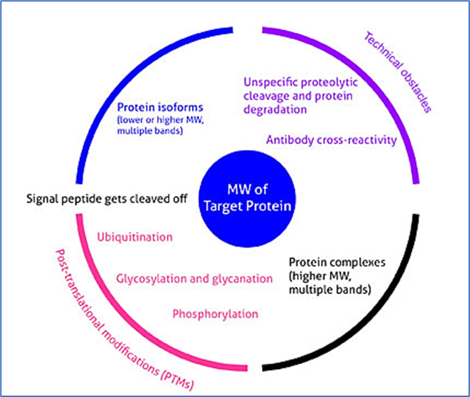 通常計算出的分子量與在 Western blot 實驗結果觀察到不同。在這裡,我們整理了最常見原因 (Fig. 1)。