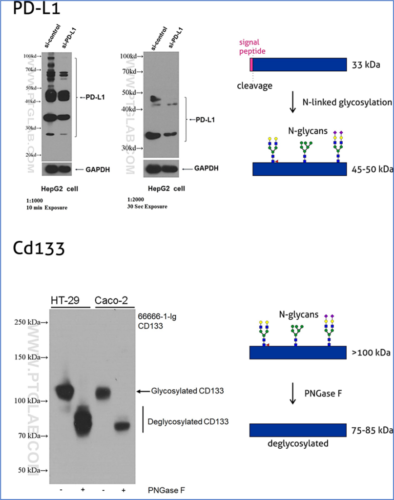 Fig. 3 PD-L1 (Programmed cell death ligand 1, Cat No. 66248-1-Ig) 是一種第I型跨膜蛋白,在免疫反應中扮演關鍵的調節作用。PD-L1 全長為 33 kDa,其中 N-linked glycosylation 後分子量為 45-70 kDa,主要醣基化形式為 45-50 kDa 。