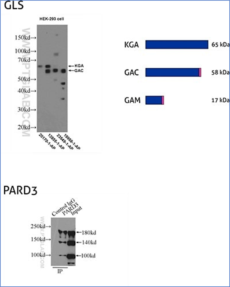 Fig. 8 GLS (GLS1, KIAA0838) 屬於 glutaminase 的成員。GLS 有三種異構體,分別為 KGA / GAM / GAC,分子量與組織表達模式各不相同 (PMID: 11015561) 。KGA (kidney-type glutaminase, 65 kDa) 。GAC (glutaminase C, 58 kDa),基因剪接 (gene splicing) 導致 KGA 的 C-terminal domain 丟失而形成的異構體。GAM 是最短的異構體並且沒有催化活性,包含內含子 2 和過早終止密碼子組成。(Cat No. 12855-1-AP 檢測 KGA / GAC; Cat No. 20170-1-AP 特異性檢測 KGA; Cat No. 23549-1-AP 檢測 GLS 的所有三種異構體 (KGA / GAM / GAC); Cat No. 19958-1-AP 特異性檢測GAC) 。