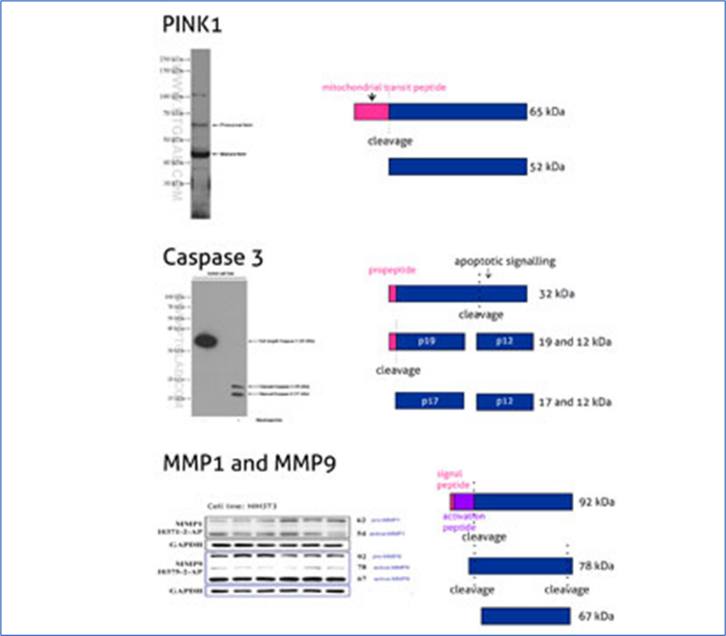 Signal peptide 可以通過各種數據庫或先前公佈的數據來進行預測 (e.g., UniProt) 。有些蛋白質前體 (protein precursor) 的蛋白質結構域有 pro-peptides,需要通過蛋白酶 (protease) 水解切割 pro-peptide 後才能產生功能性產物 (Fig. 2) 。另外,許多通過分泌途徑 (secretory pathway) 轉運的蛋白質 N-terminus 具有 15-35 個氨基酸的 signal peptide,在亞細胞運輸過程 (subcellular transport) 中經常被各種蛋白酶水解,這導致觀察到成熟蛋白質經由電泳表現的位子低於預測的分子量。