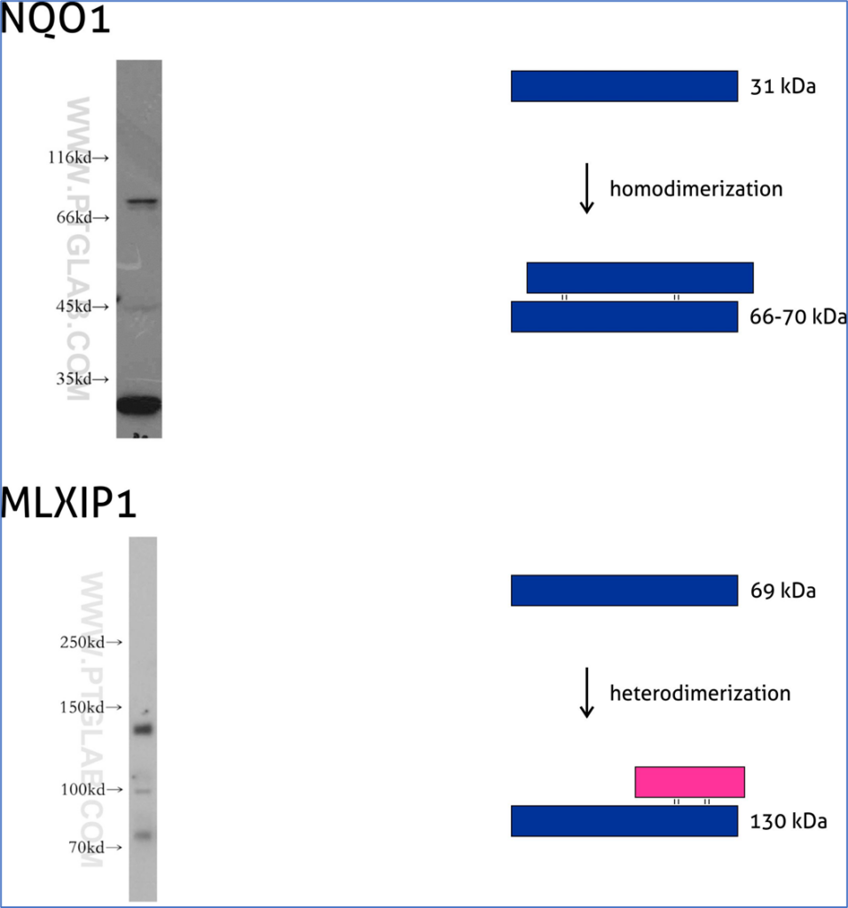 Mlx-interacting protein (MLXIP, MONDOA, Cat No. 13614-1-AP) 通過與 MLX 蛋白形成 heterodimer 的形式來做為轉錄因子,調控糖解作用和葡萄糖反應相關基因的活化。MLXIP 具有三種異構體,分子量分別為 110、57 和 69 kDa,而 MLXIP-MLX heterodimer 分子量為 130 kDa 。