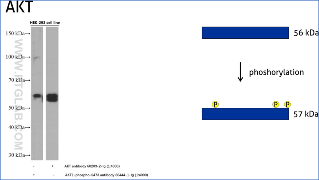 Fig. 5 serine/threonine-protein kinase AKT 在許多細胞過程中發揮作用。存活因子 (survival factors) 可以透過活化 serine/threonine-protein kinase AKT1 以不依賴於轉錄的機制抑制細胞凋亡 (Cat No. 60203-2-Ig 檢測 total AKT; Cat No. 66444-1-Ig 檢測 AKT-phospho-S473) 。