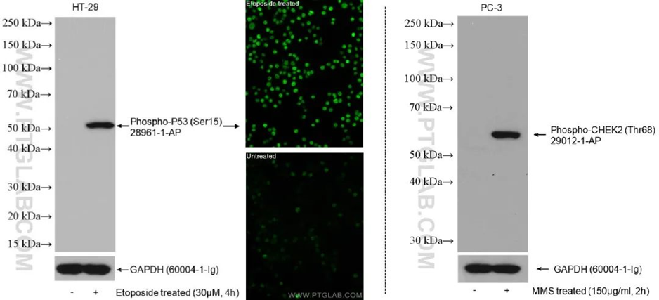 ▲Fig. 2 Etoposide 誘導 HT-29 細胞 P53(Ser15) 磷酸化和 MMS 誘導 PC-3 細胞 CHEK2(Thr68) 磷酸化。