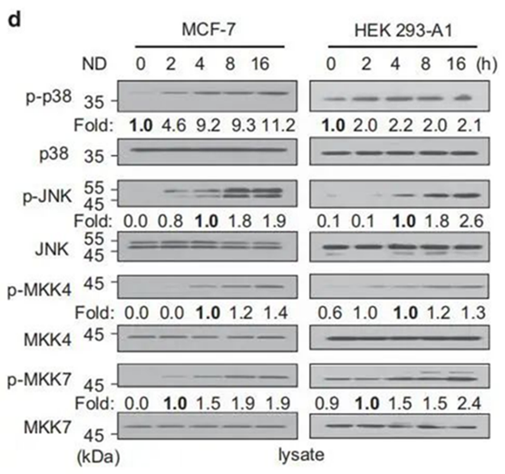 Nocodazole 是一種能使微管聚合 (Microtubules polymerization) 的可逆抑制劑,實驗室常使用 Nocodazole 調控細胞停滯在 G2/M 週期或誘導細胞凋亡。細胞在同步到有絲分裂時 ASK1 被啟動。ASK1 又分別通過 MKK3/MKK6和MKK4/MKK7 的磷酸化啟動 p38 和 JNK (Fig. 6,參考文獻 4)。