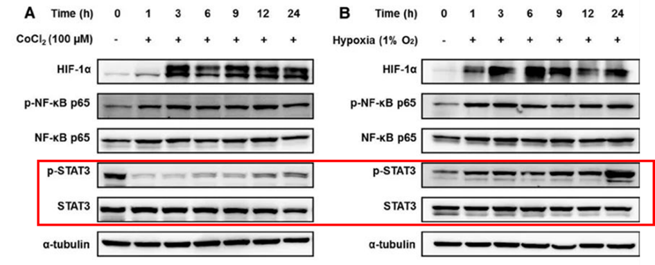 ▲Fig. 1 在CoCl2處理和正常缺氧環境下,STAT3的磷酸化表現量顯示出不一致的趨勢。