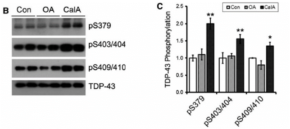 5. Gu, Jianlan et al. Protein Phosphatase 1 dephosphorylates TDP-43 and suppresses its function in tau exon 10 inclusion. FEBS letters vol. 592,3 (2018): 402-410. doi:10.1002/1873-3468.12976