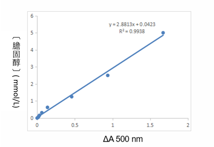 ▲Figure.  96 well plate分析的膽固醇標準曲線。資料和曲線僅供參考,實驗者需根據自己的實驗建立標準曲線。