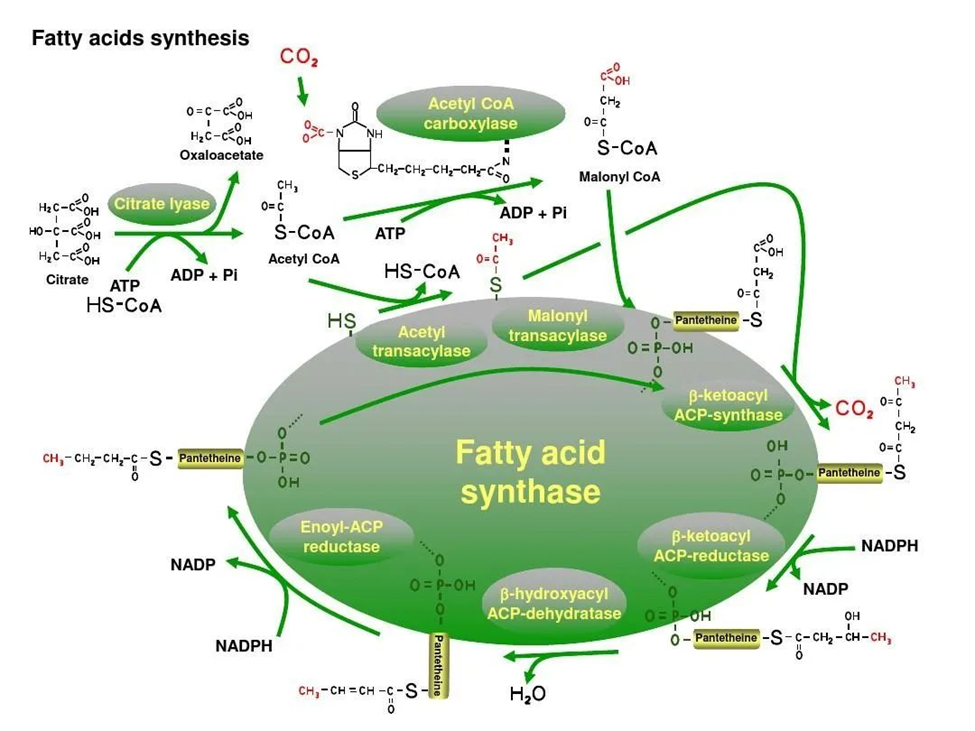其原理是FAS催化乙醯CoA、丙二醯CoA和NADPH生成長鏈脂肪酸。