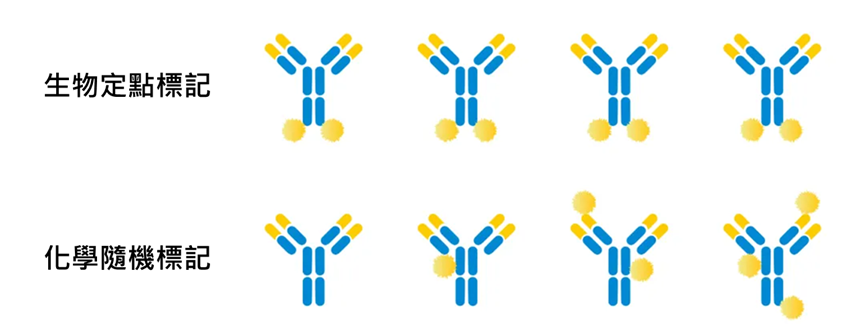 與市面上常用的化學隨機標記相比,生物定點標記技術不僅能夠保證偶聯物遠離抗體活性中心,僅在Fc末端而不影響抗體的抗原識別與結合能力,同時還能確保信號強度的均一性和批次間標記情況的重複性。