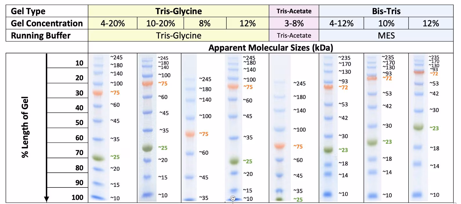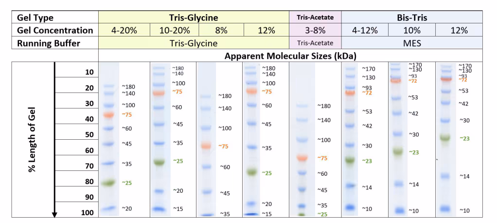 關於marker的計算值,一般情況下以 Tris-Glycine 膠體系中的值為準,但因為蛋白質本身的各種性質,會導致它們在不同的膠體系中,出現的位置稍有差異,因此在Bis-Tris中,其電泳後出現的位置就與 Tris-Glycine 中有一些差異,上述測試的這些結果也是便於使用不同膠體系的客戶來進行參考;對於還沒有選擇好膠體系的客戶,我們推薦以 Tris-Glycine 體系中的值為準喔!