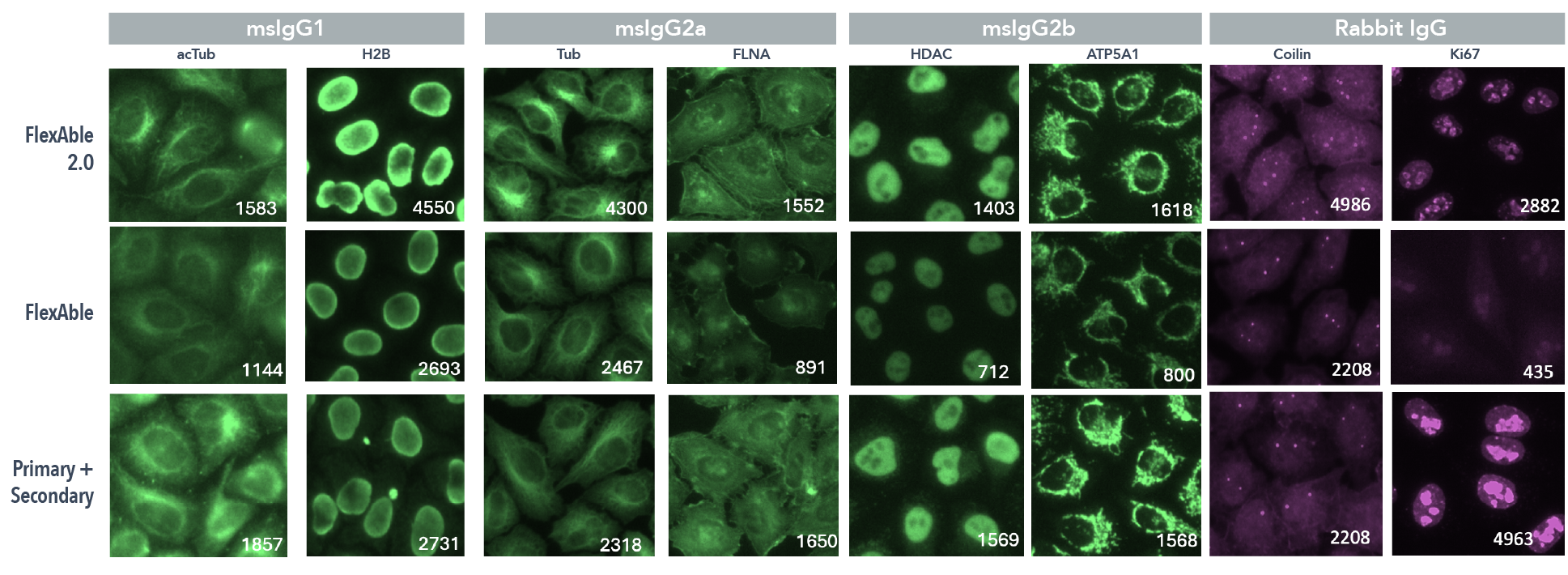 FlexAble 2.0 & 1.0 標記抗體 與 二抗 的比較