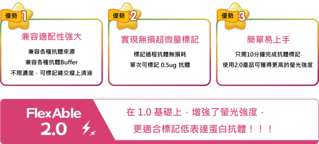 所以這次我們重新升級了 ” FlexAble抗體標記試劑盒 “,然後重磅推出了 ” FlexAble 2.0 抗體標記試劑盒 ” 新產品!