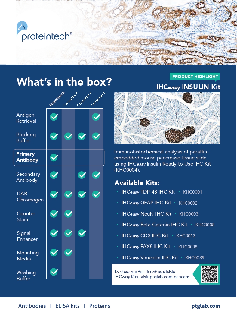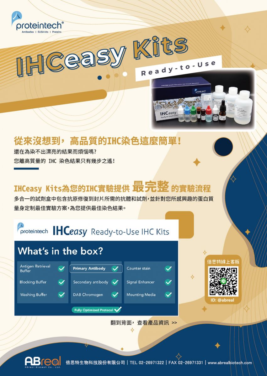 IHC實驗最麻煩之處就是要根據不同的sample及target,去調整溫度、濃度、pH值等條件。而實驗中用到的buffer如此之多,即使出了問題也不知該從何調整起。因此,Proteintech這次推出了新產品IHCeasy kits,整套protocol皆進行了多次驗證以及完整的優化,幫您配置好Ready to use的濃度及條件,讓您不用再擔心buffer濃度和pH值調配等問題。