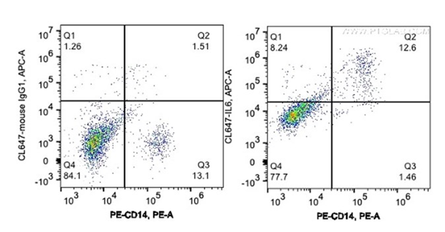 ▲Human PBMCs are treated by LPS and protein transporter Brefeldin A. 1*10^6 stimulated human PBMCs were surface stained with PE Anti-human CD14 (PE-65056, Clone: UCHM-1), fixed by 4% PFA and then permeabilized by 1X Flow Cytometry permeabilization buffer (PF00011-C). Cells were then intracellularly stained with 1ul CoraLite®647-conjugated Anti-human IL6 (CL647-69001, Clone: 4G3E6), or CoraLite®647-conjugated mouse IgG1 isotype control.