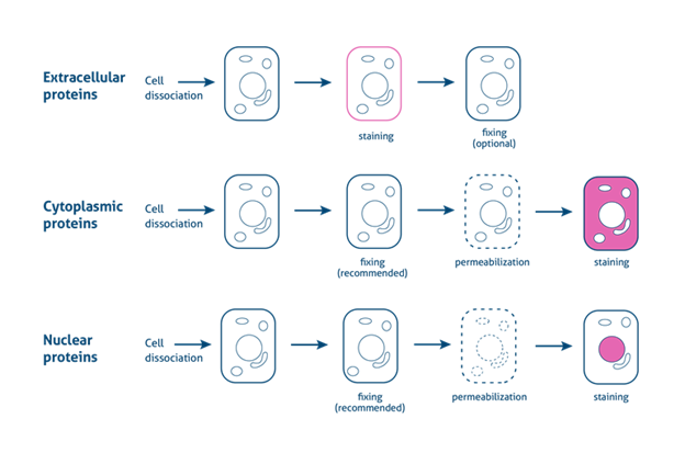 實驗步驟與細胞質目標檢測類似,轉錄因子和其他核蛋白的染色需要在表面標記(Surface marker)染色後進行細胞固定和透化。而根據轉錄因子的性質以及在細胞核、DNA 或其他蛋白質上的位置,可能會需要不同的固定和透化步驟。