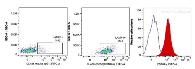 ▲Human PBMCs are stimulated by PHA for 3 days. Cells were intracellularly stained with 5ul CoraLite488 Anti-human CD107a (H4A3) (red), or 0.2ug CoraLite488 mouse IgG1 isotype control (blue). Cells were fixed by 4% PFA and permeabilized with 1X intracellular flow cytometry perm buffer (PF00011-C). Lymphocytes are gated.