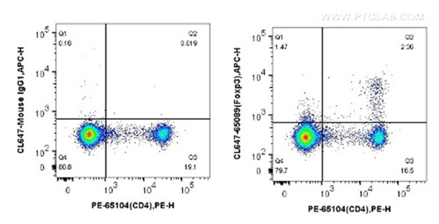 ▲1X10^6 mouse splenocytes were surface stained with PE Anti-Mouse CD4 (GK1.5) (PE-65104, Clone: GK1.5) and then fixed by Transcription Factor fixation buffer and permeabilization buffer (PF00011-C). Cells were then stained with 5 ul CoraLite®647-conjugated Anti-Mouse Foxp3 (CL647-65089, Clone: 3G3), or CoraLite®647-conjugated mouse IgG1 isotype control.