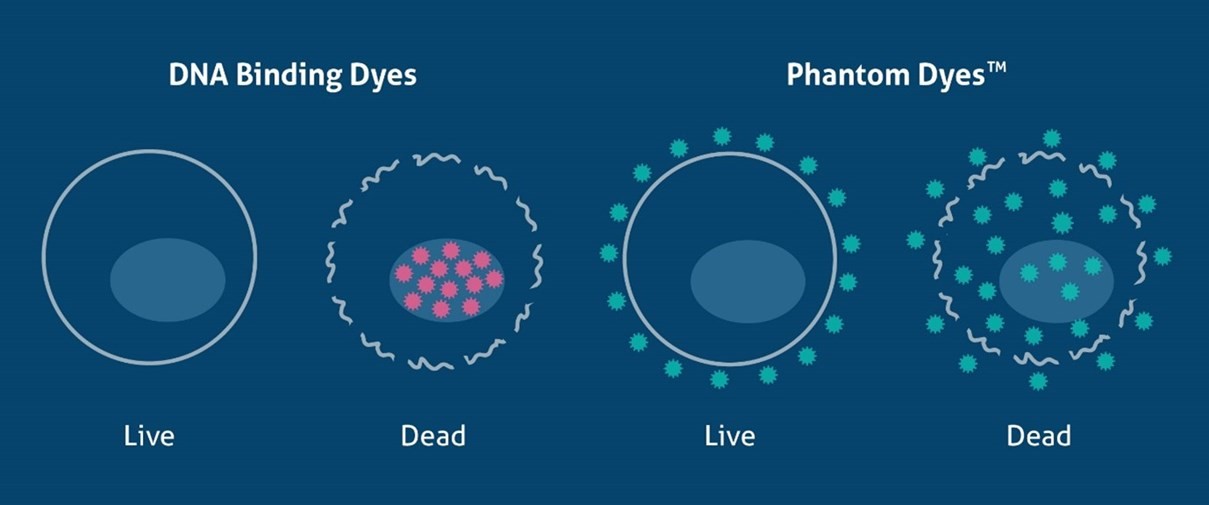 (圖1) Schematic of the mechanism of DNA binding dyes and Phantom Dyes (fixable viability dyes), demonstrating how they differentiate live and dead cells.