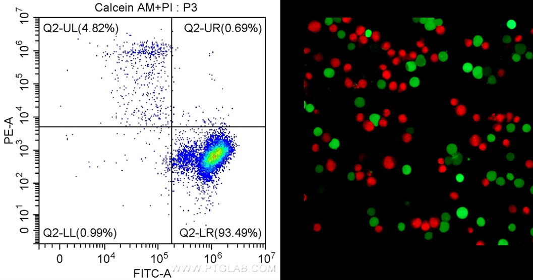 Proteintech has a Viability/Cytotoxicity Assay Kit for Animal Live & Dead Cells (Calcein AM, PI Method, Cat# PF00007) and (Calcein AM, EthD-I Method, Cat# PF00008).