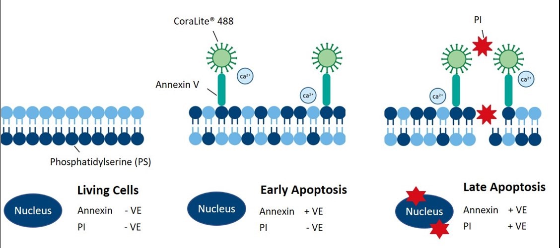 Annexin V會與細胞凋亡的早期標誌物:細胞外磷脂蛋白(PS)結合。活細胞的細胞膜的內側會含有PS,然而,在細胞凋亡的早期階段,PS被翻轉到細胞膜的外側;隨著PS暴露在細胞外空間,Annexin V即可結合到PS,若是Annexin V帶有螢光,則早期凋亡的細胞就會被螢光標定,因而區分活細胞和凋亡細胞。 Proteintech的 CoraLite®488-Annexin V和PI凋亡檢測套件(PF00005)即是利用螢光結合Annexin V與PI(圖3)同步分析早期、晚期的凋亡細胞