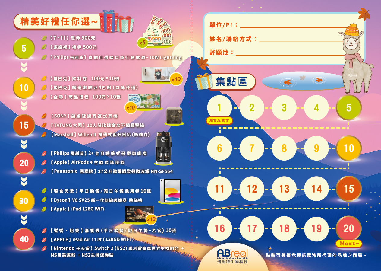 集點換贈品,不同的點數可兌換不同的贈品。
